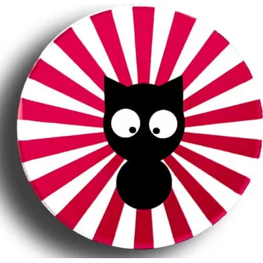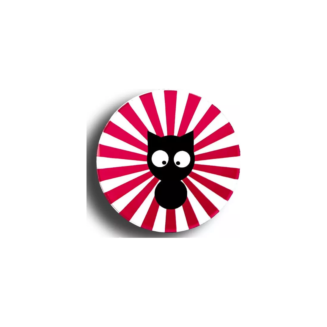 Badge rigolo et original, avec un mignon petit chat noir aux grands yeux, sur fond de rayons rouges japonisants, émouvant et kawaii.