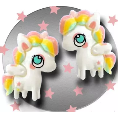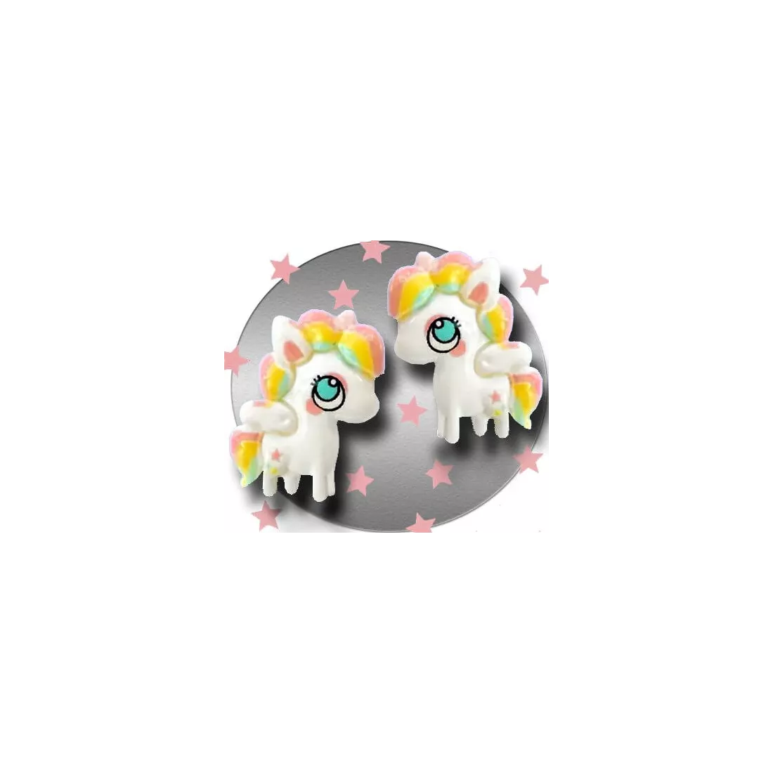 Paire de décorations de lacets en forme de jolie petite licorne aux grands yeux clairs et à la somptueuse crinière arc-en-ciel rose, jaune & bleu-vert .... parce qu'elle le vaut bien :-)