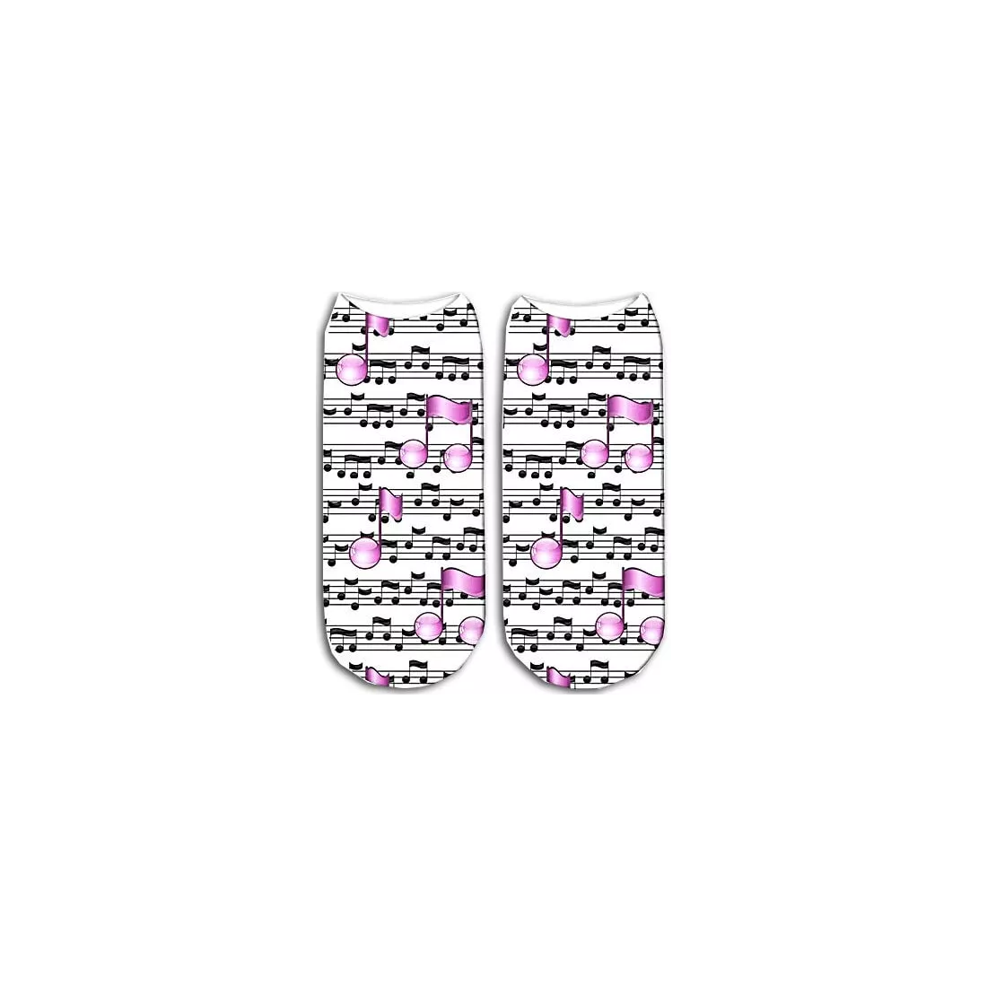 Paire de socquettes blanches, décorées de partitions et notes de musiques noires & roses doux, pour des pieds mélomanes.