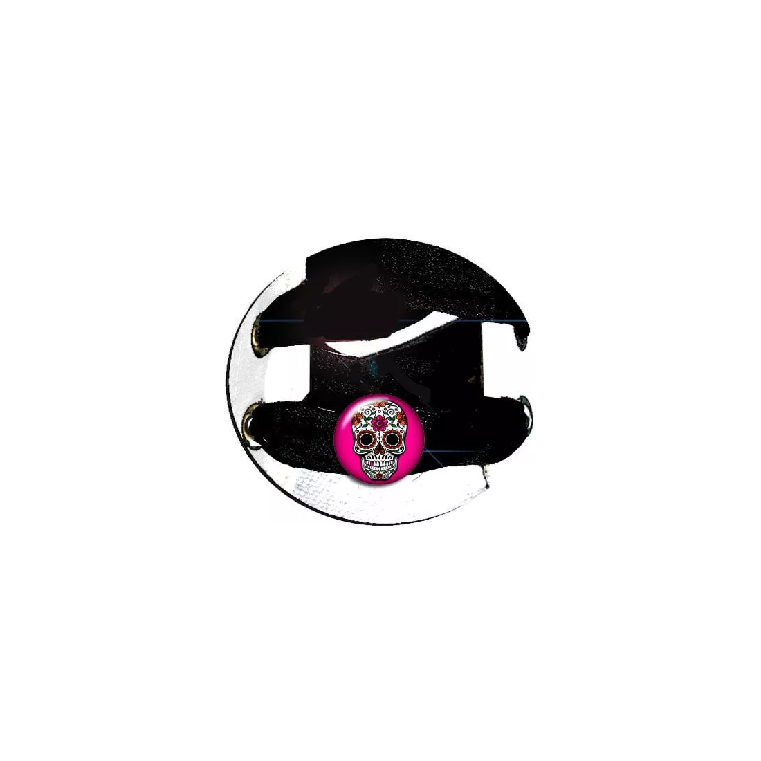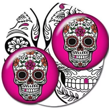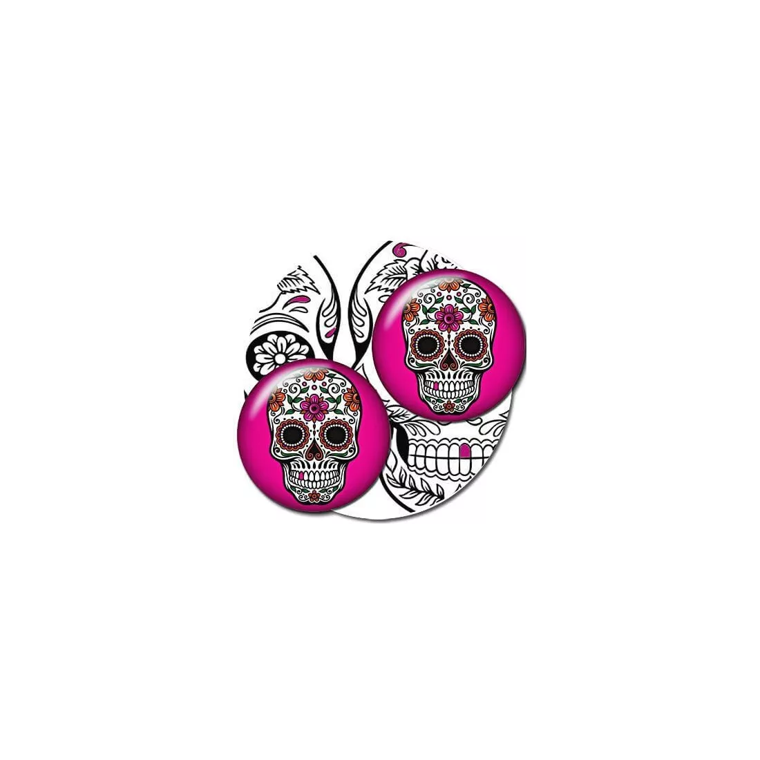 Paire de décorations de lacets rondes, avec un joli fond rose fuchsia avec un crâne mexicain calavera blanc, finement décorés de motifs noirs et colorés.