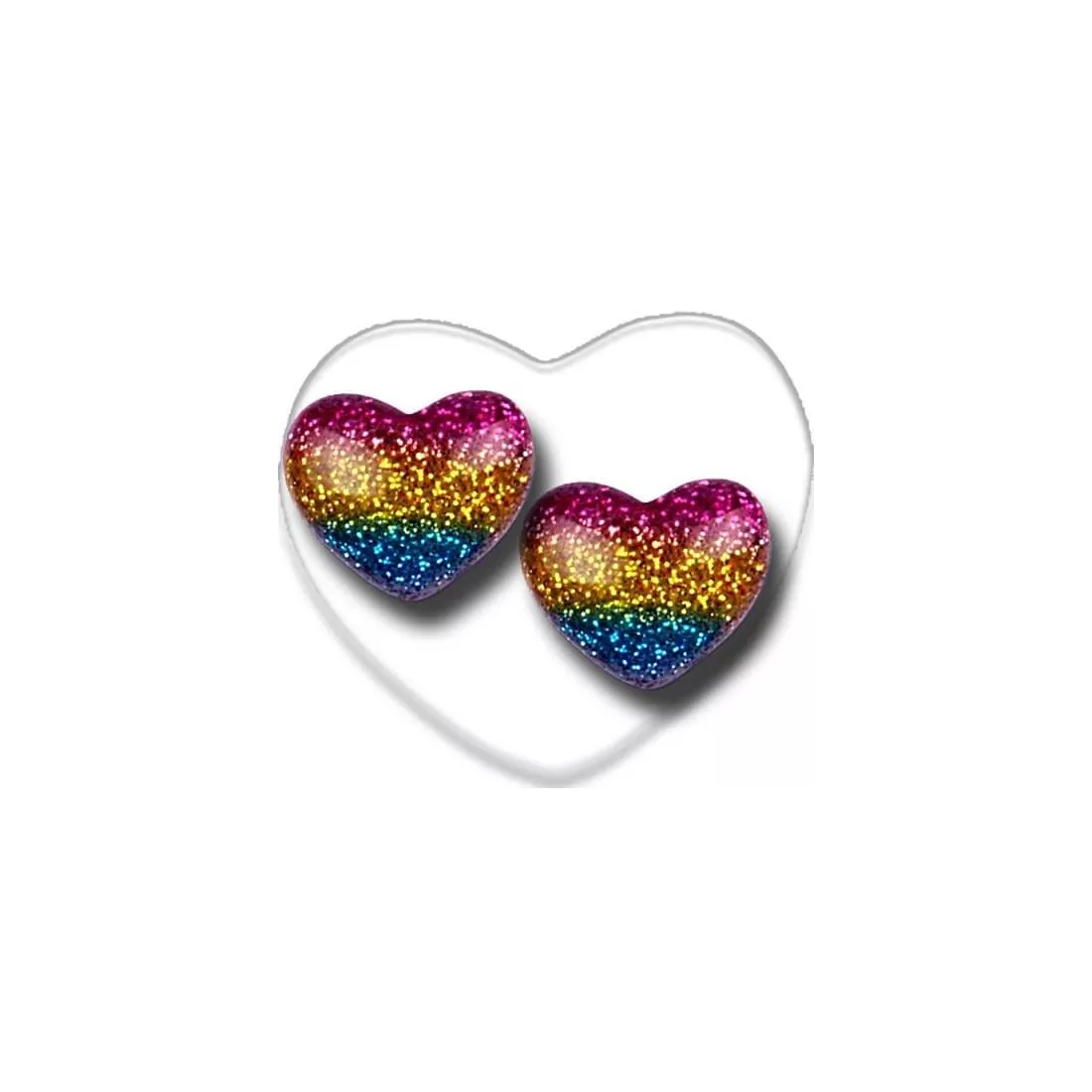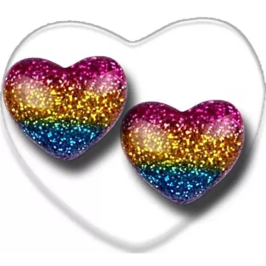 Paire de décorations de lacets , en forme de mignons petits coeurs dodus & pailletés brillants, aux coloris multicolores de l'arc-en-ciel : en rose, bleu, argenté, doré.
