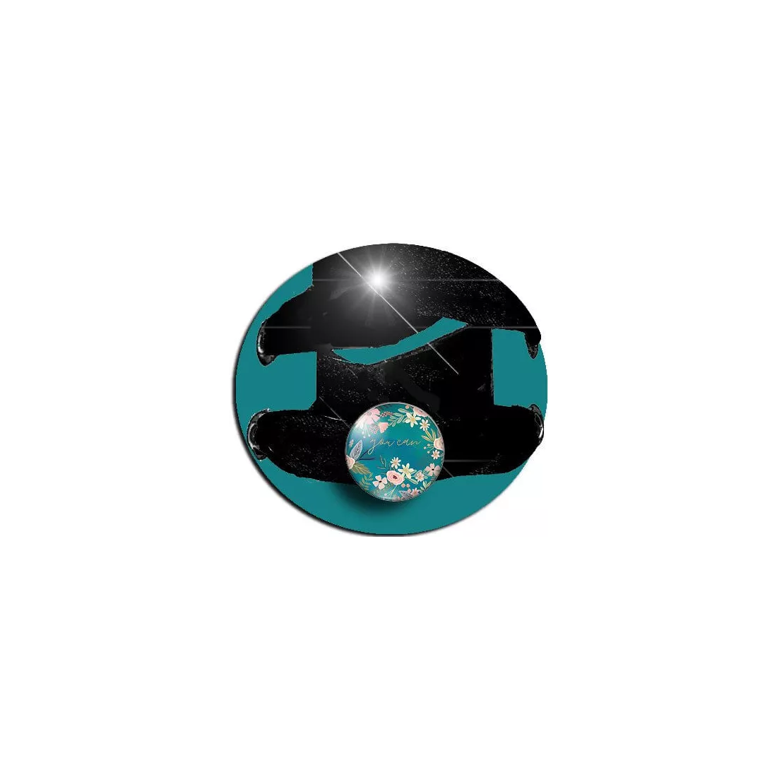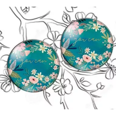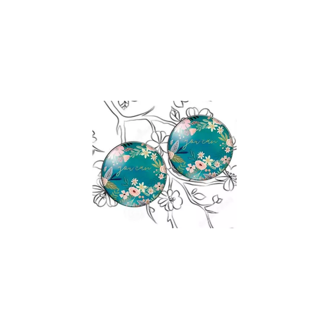 Set de 2 petites décorations de lacets rondes décorées de délicates fleurs de cerisier japonais roses, aux feuilles vertes, posées sur un superbe fond couleur bleu-vert paon.