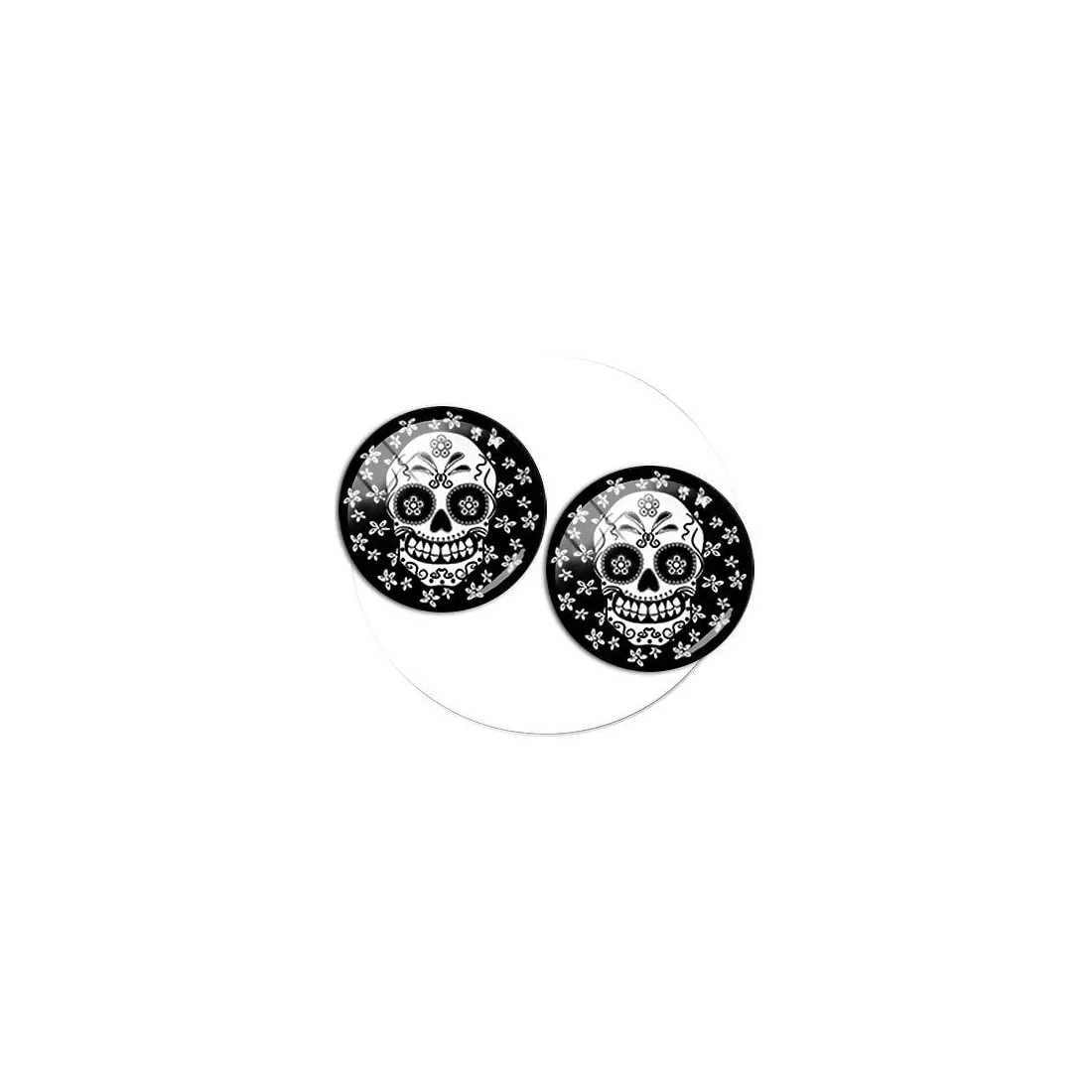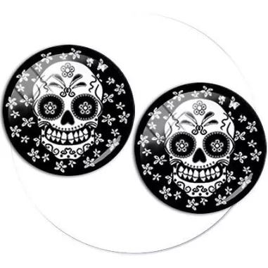 Paire de décorations de lacets rondes et noires, décorées d'une inquiétante tête de mort blanche mexicaine type calavera, entourée de minuscules fleurs blanches et dotée d'un grand sourire sardonique :-(