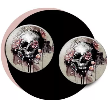 Paire de décorations de lacets rondes, décorées d'une tête de mort blanche, embellie de fleurs délicates aux tons doux, poudrés & féminins de rose, nude, beige, orangé.
