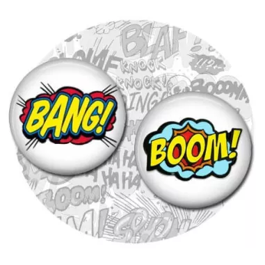 Set de 2 décorations de lacets rondes, décorées des onomatopées BANG! et BOOM!, multicolores, joyeuses et bruyantes pour les fans de BD et de mangas.