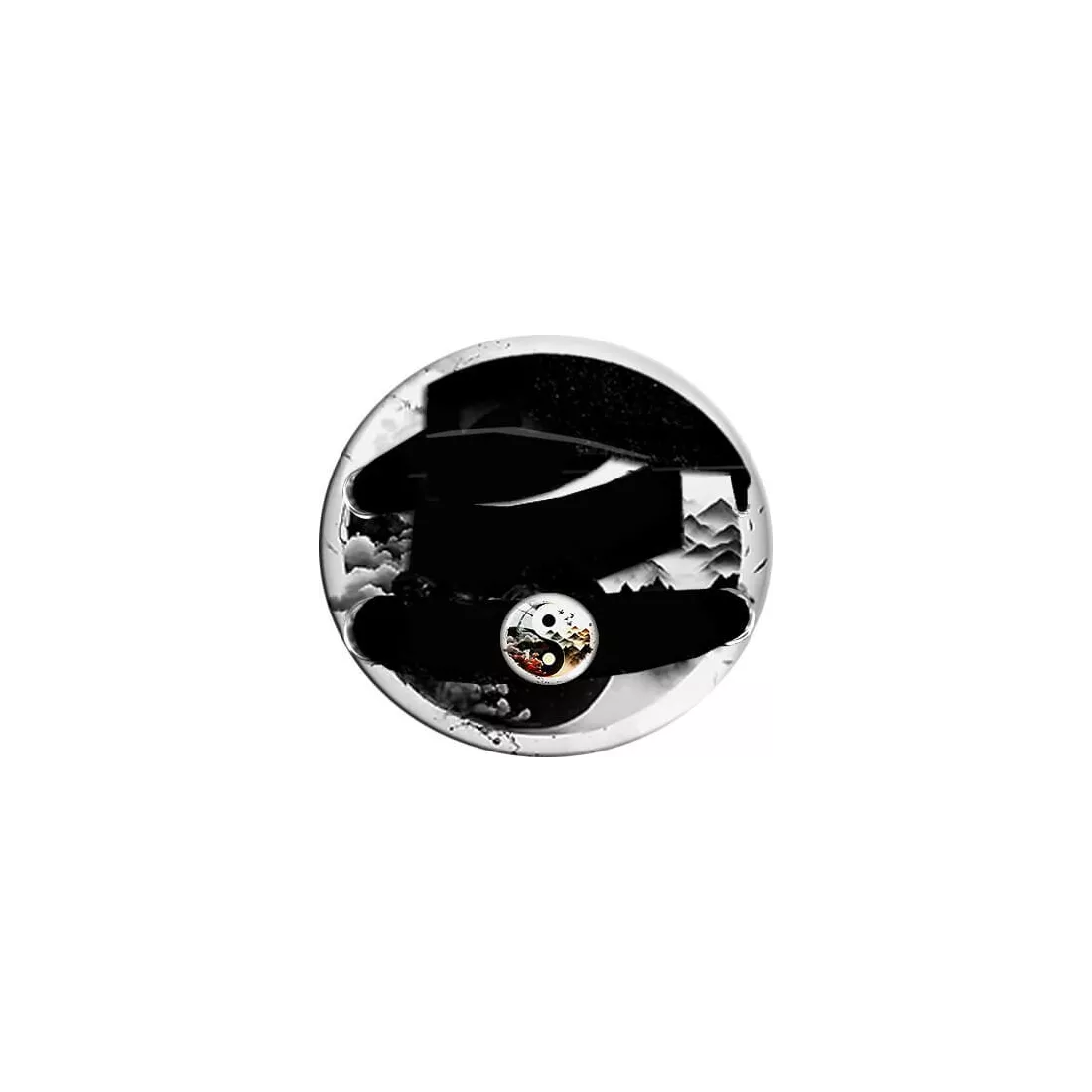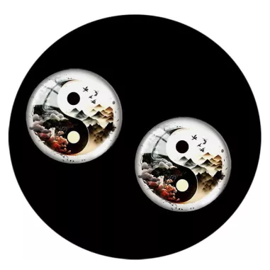 Paire de décorations de lacets rondes et blanches, sereinement décorées d'un motif noir Yin et Yang orné d'un délicat paysage japonisant avec nuages, montagnes et oiseaux, dans les tons rouge, vert, jaune, rouge, orange, gris.