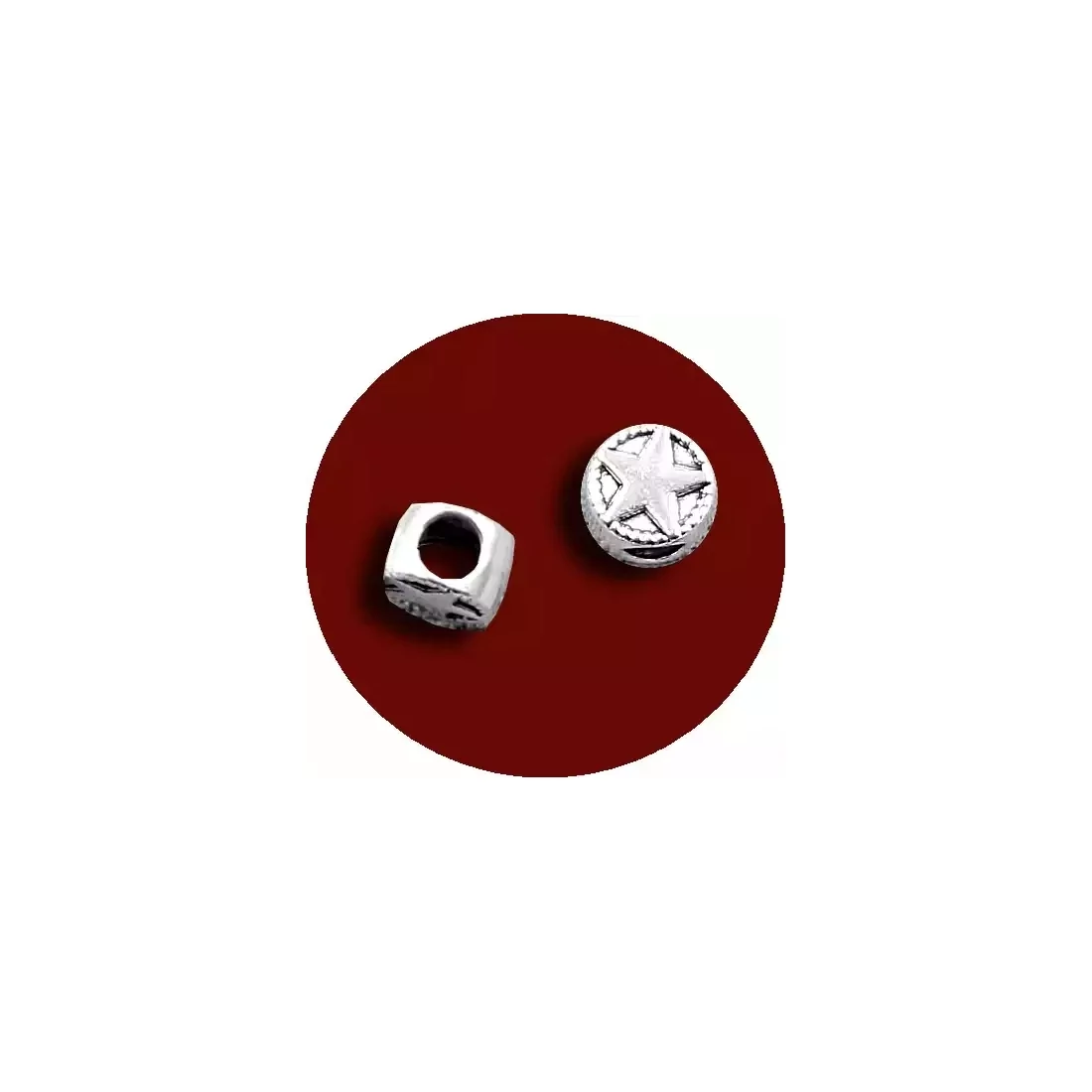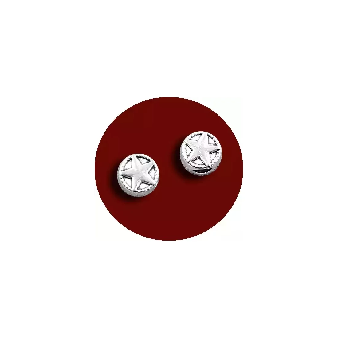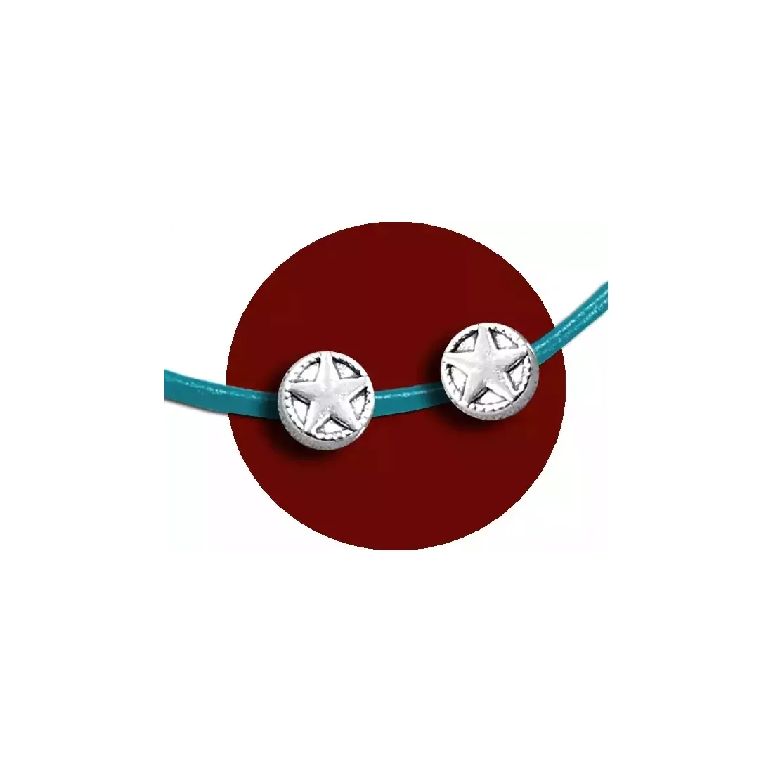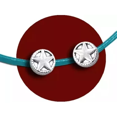 Set de 2 mini et mignonnes décorations de lacets à enfiler, rondes, en métal, décorées d'une étoile et d'un fin liseret embossés en volume (recto et verso), argentées et brillantes.