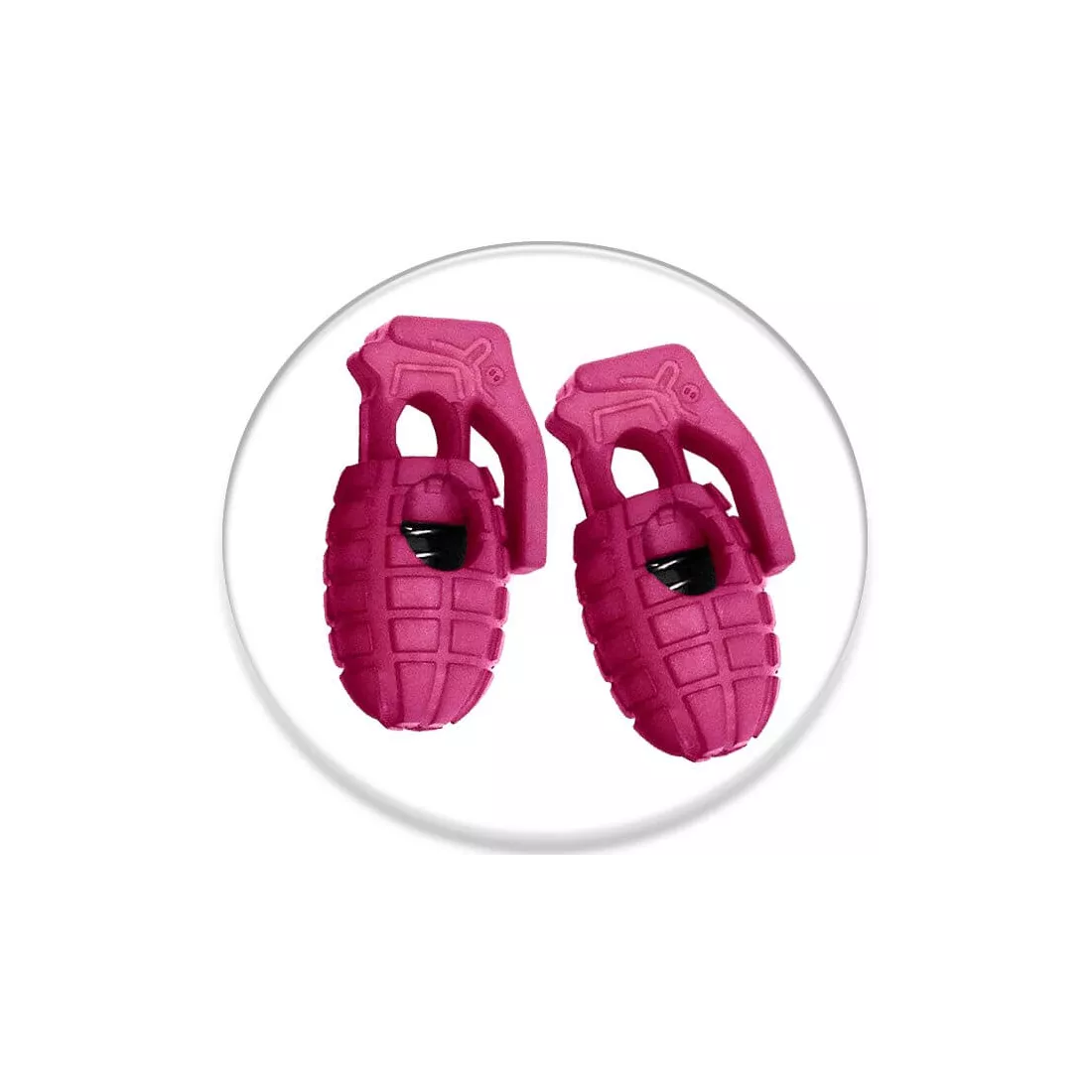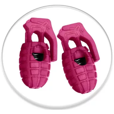 Drôle, décalée, pratique et décorative, paire de 2 bloqueurs de lacets en forme de grenades explosives dans un superbe rose fushia dense et vif.