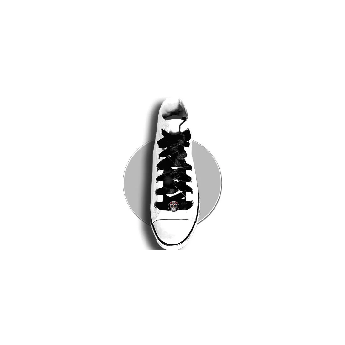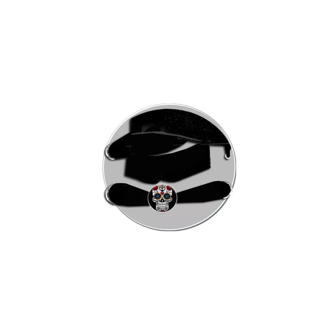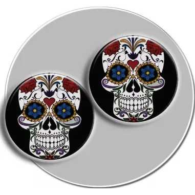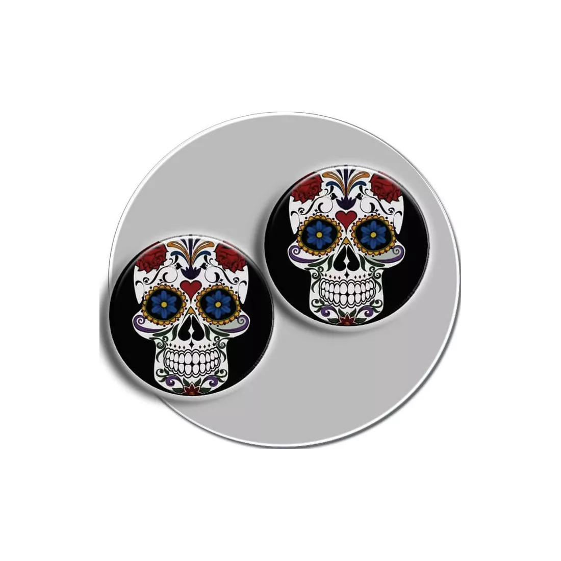 Paire de décorations de lacets, rondes, décorées d'un crâne calavera mexicain blanc aux motifs multicolores, sur fond noir.