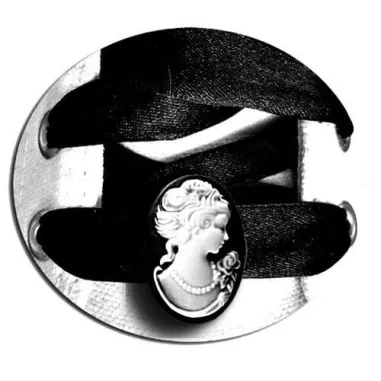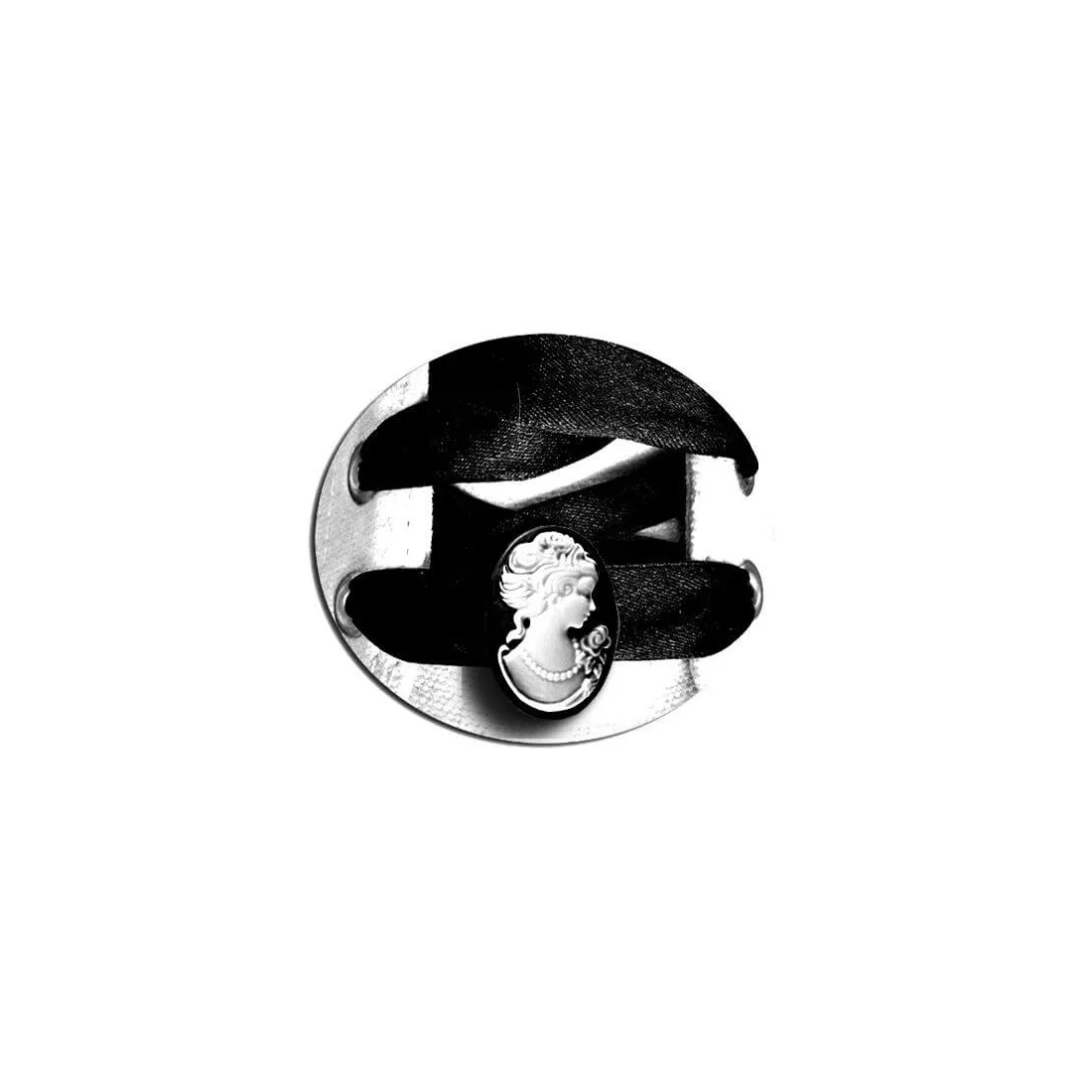 Paire de décorations de lacets en forme de camée ovale, décorées d'une belle dame blanche sur fond noir, délicieusement vintages.