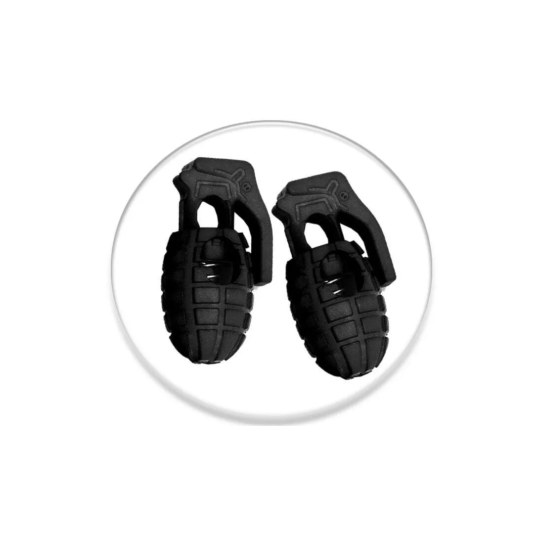 Drôle, décalée, pratique et décorative, paire de 2 bloqueurs de lacets en forme de grenades explosives dans un sombre coloris noir.