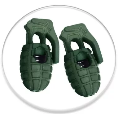 Drôle, décalée, pratique et décorative, paire de 2 bloqueurs de lacets en forme de grenades explosives dans un sombre vert kaki.