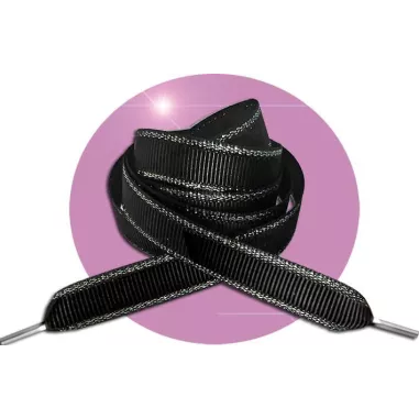 Paire de lacets plats joliment texturés, en noir profond, et soulignés d'un féminin & élégant liseret argenté brillant.
