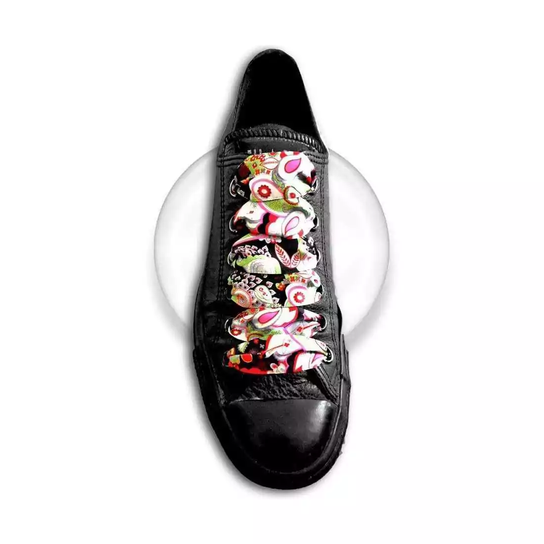 Sublime paire de lacets en satin, féminins et soyeux, avec de délicats motifs Japon de pétales, feuilles & fleurs dans des tons de noir, rose, rouge, blanc, bordeaux, vert & gris.