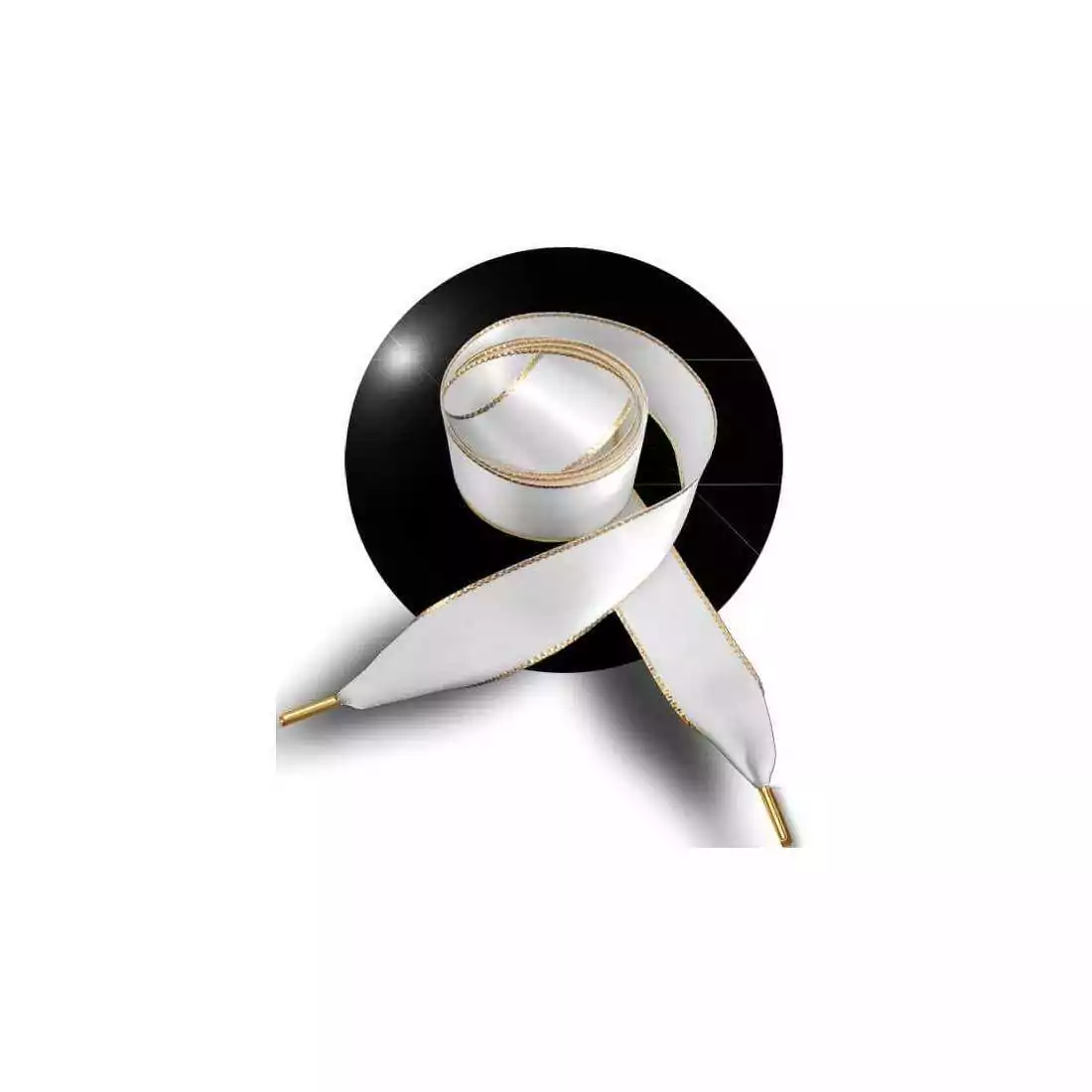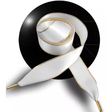 Lacets de chaussures, en satin large, féminins & soyeux, en blanc pur, joliment souligné d'un fin liseret doré, pailleté et brillant.