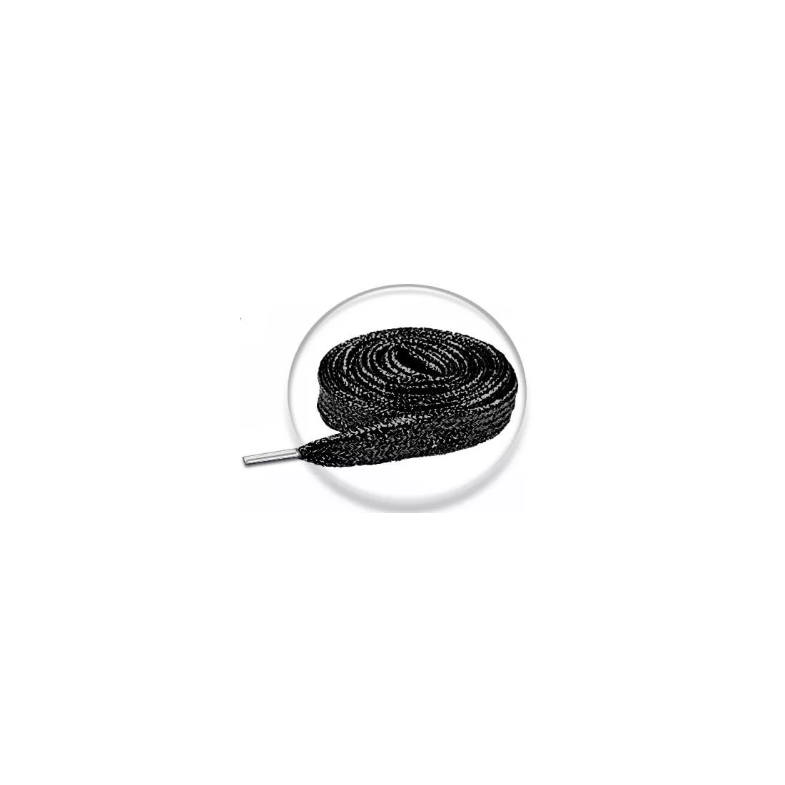 Paire de lacets plats, métallisés, dans un sombre coloris noir profond glossy, brillants, pailletés et actuels.