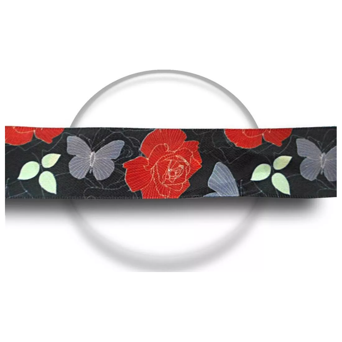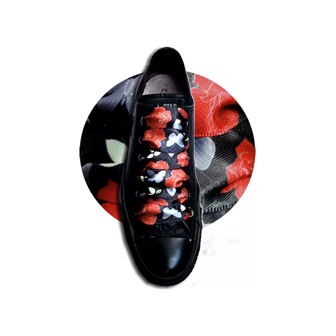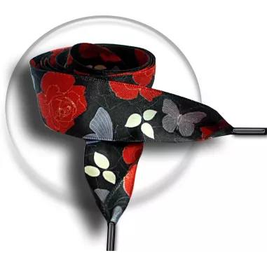Paire de lacets de chaussures, en satin large noir profond, rehaussés d'un délicat filigrane et de petites feuilles, de papillons gris et de grandes fleurs dans un magnifique coloris rouge-rouille, pour illuminer et réchauffer votre hiver.