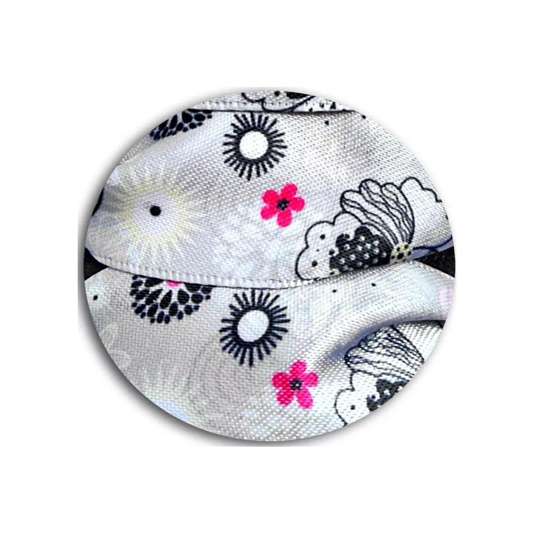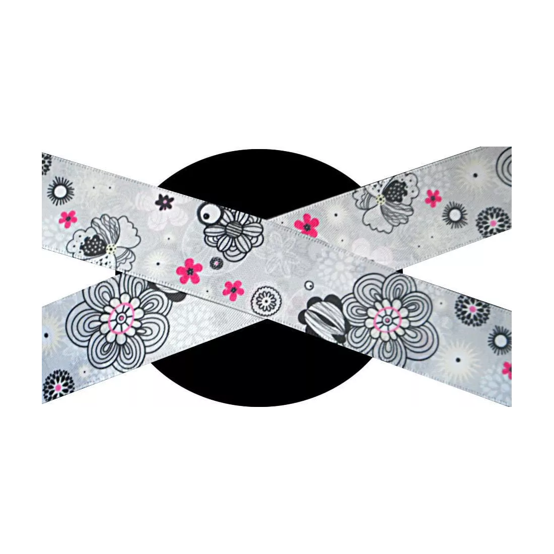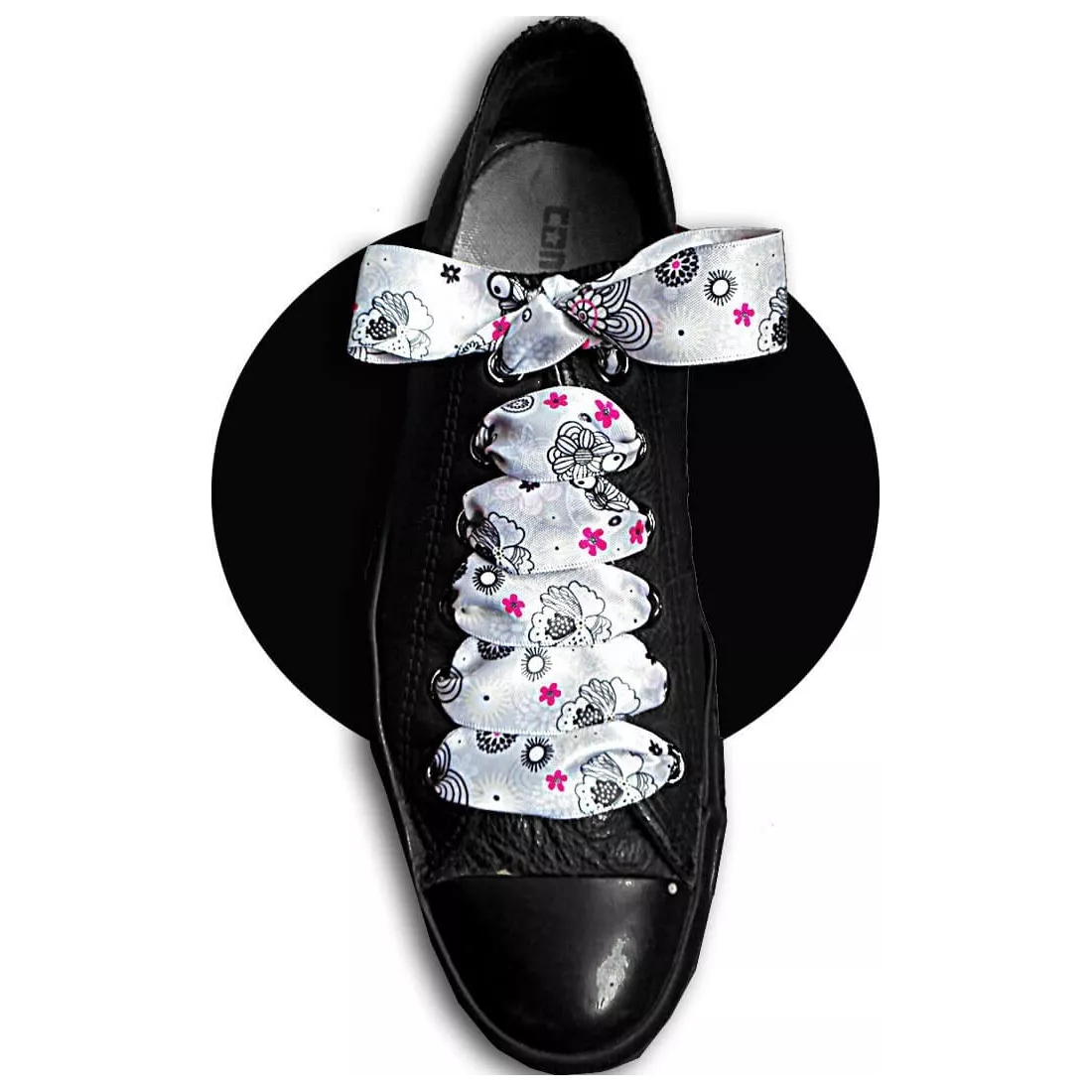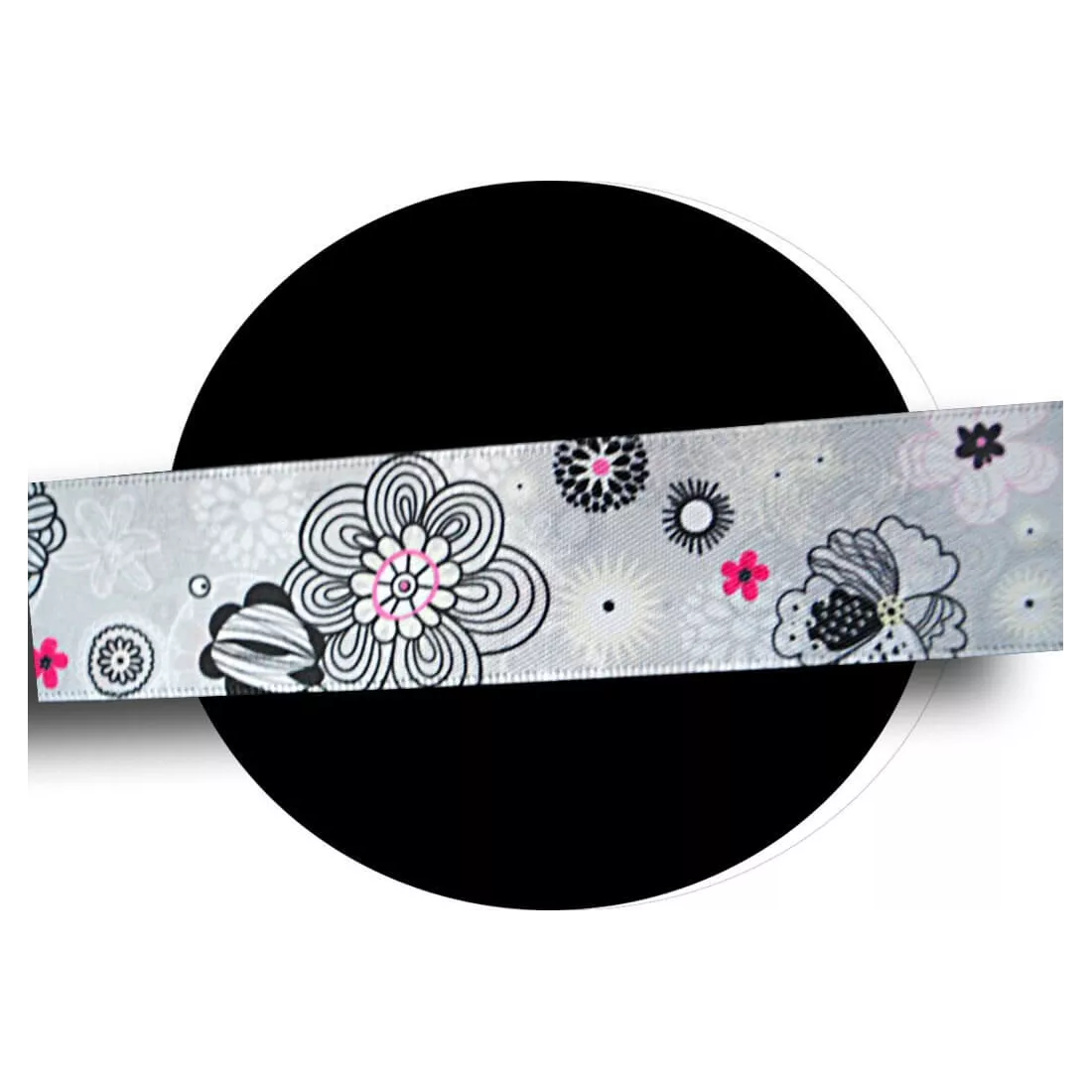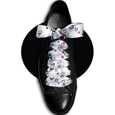Paire de lacets de chaussures, en satin large, dans un superbe coloris gris perle, doux & lumineux, décorés de motifs fins & délicats blancs, roses & noirs, dans un esprit très Japon.