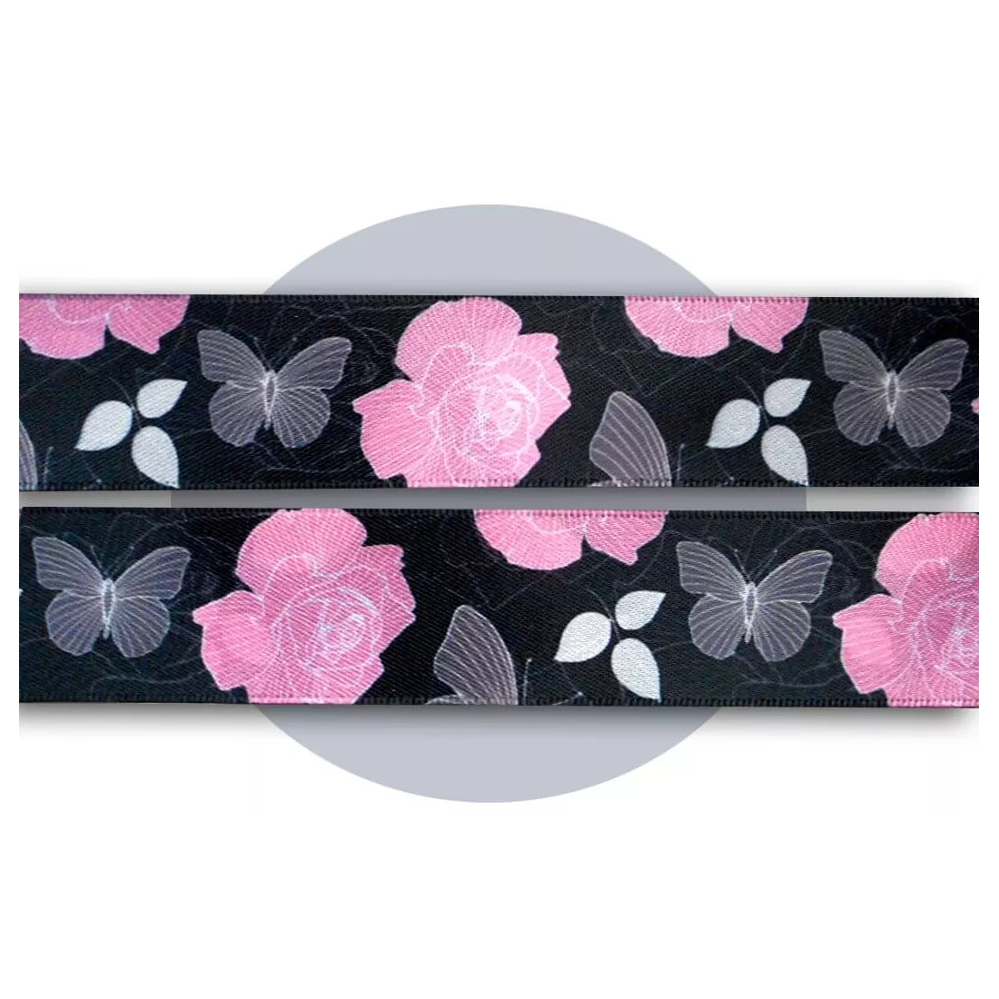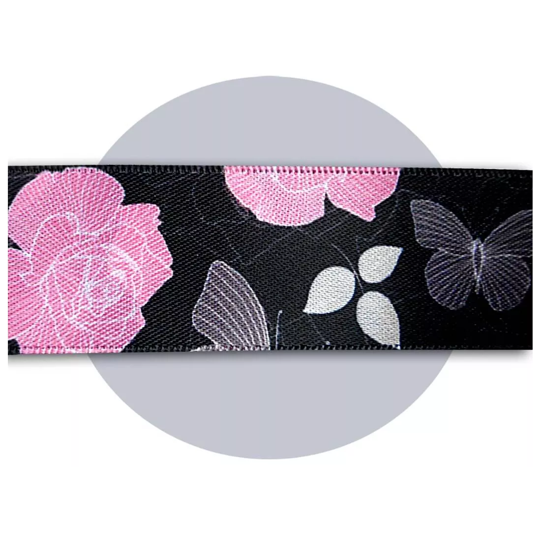 Lacets satin large noir fleuris gris & rose