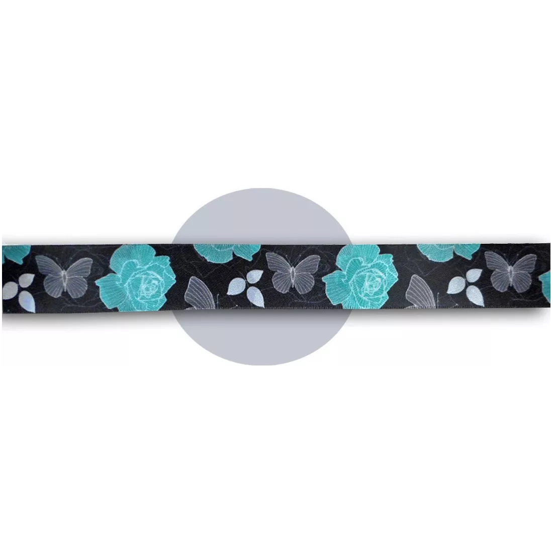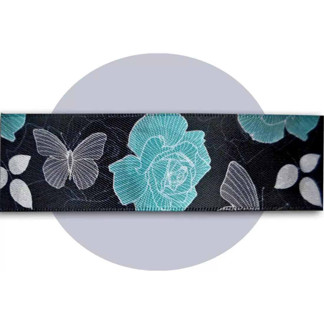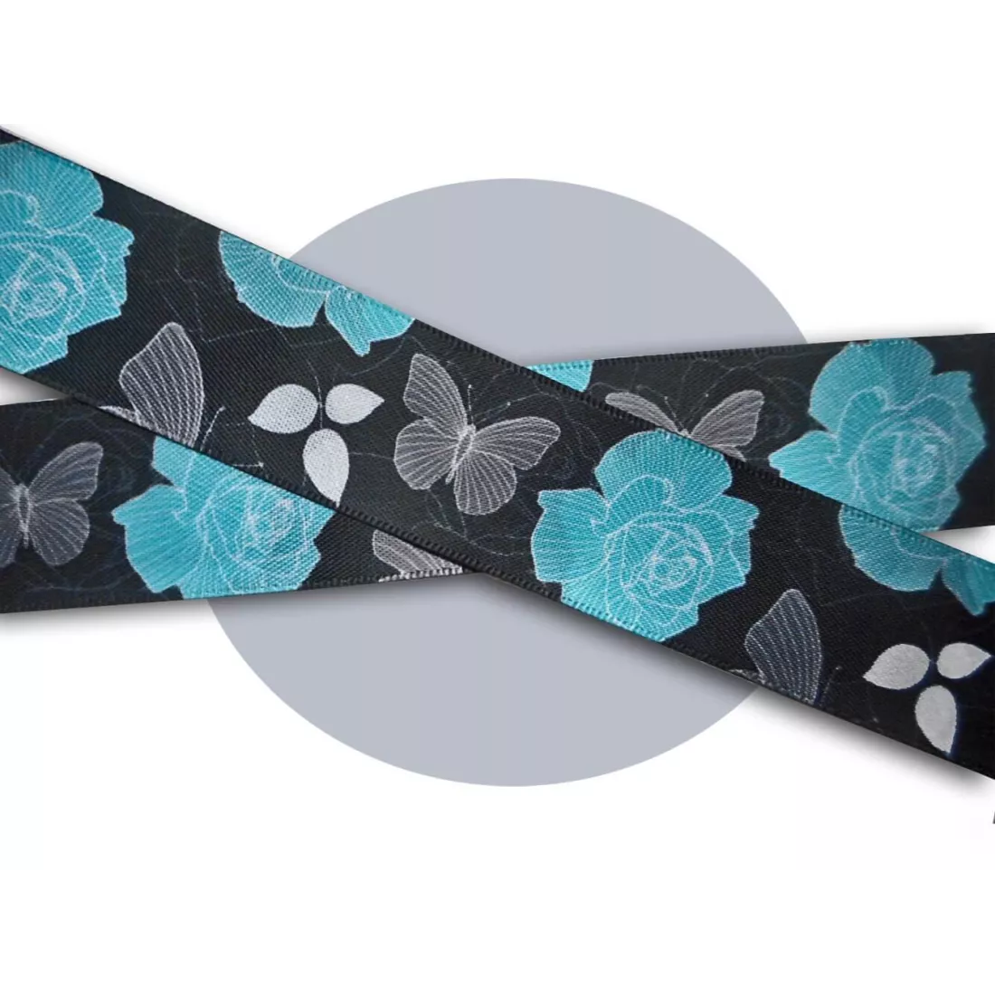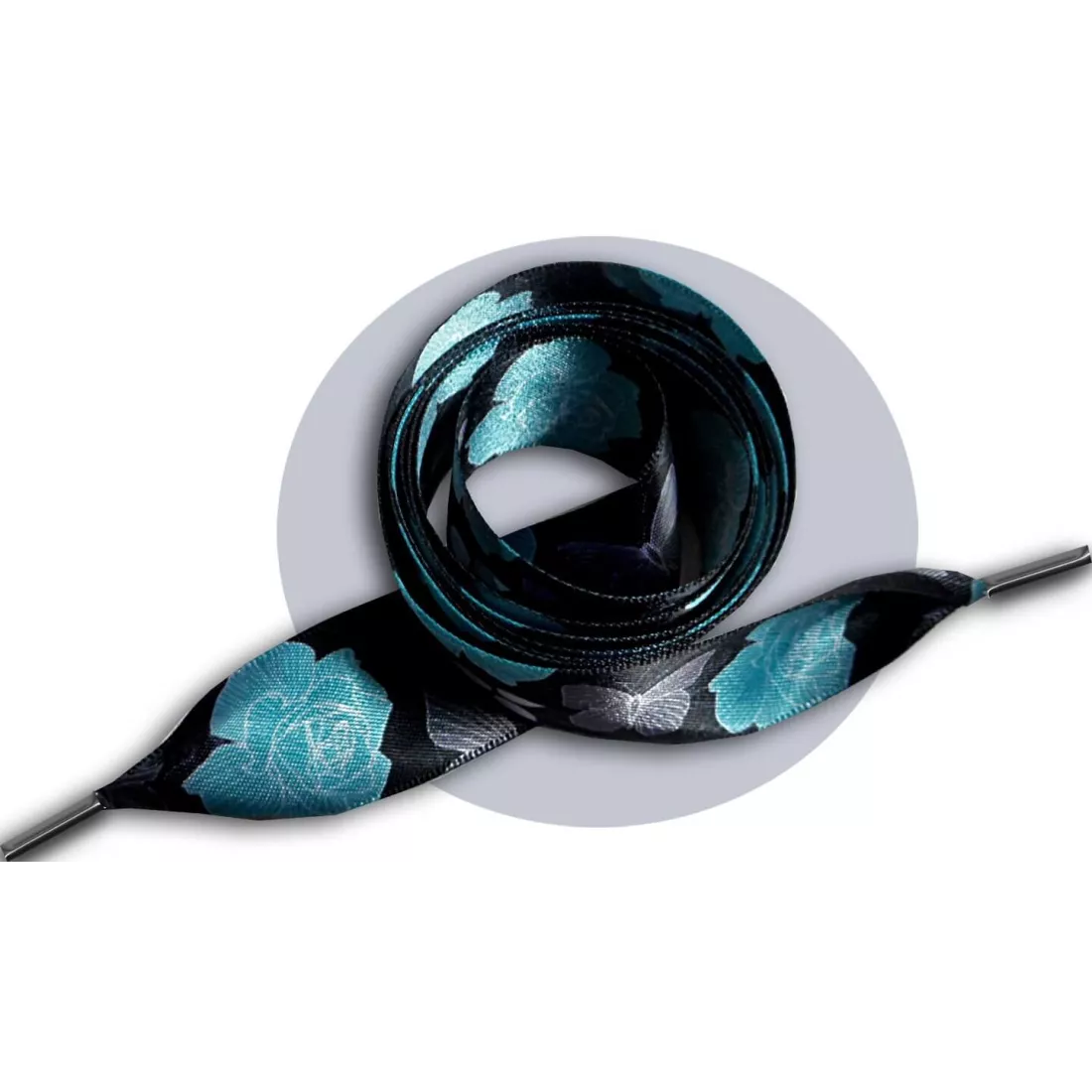 Paire de lacets de chaussures, en satin large noir profond, rehaussés d'un délicat filigrane et de petites feuilles, de papillons gris et de grandes fleurs dans un sublime coloris bleu turquoise, pour illuminer et réchauffer votre hiver.