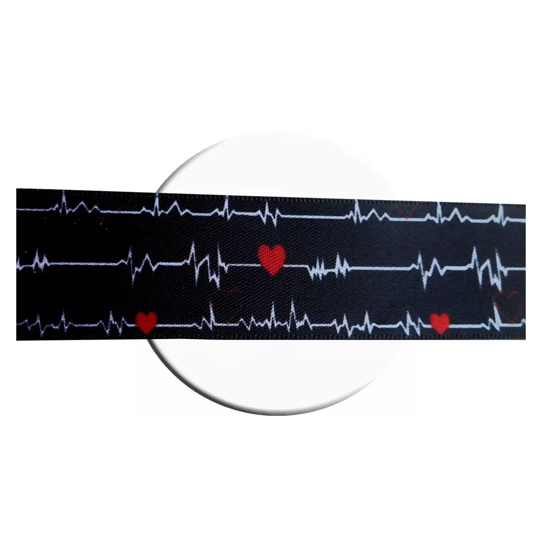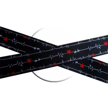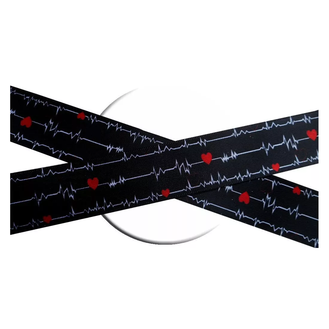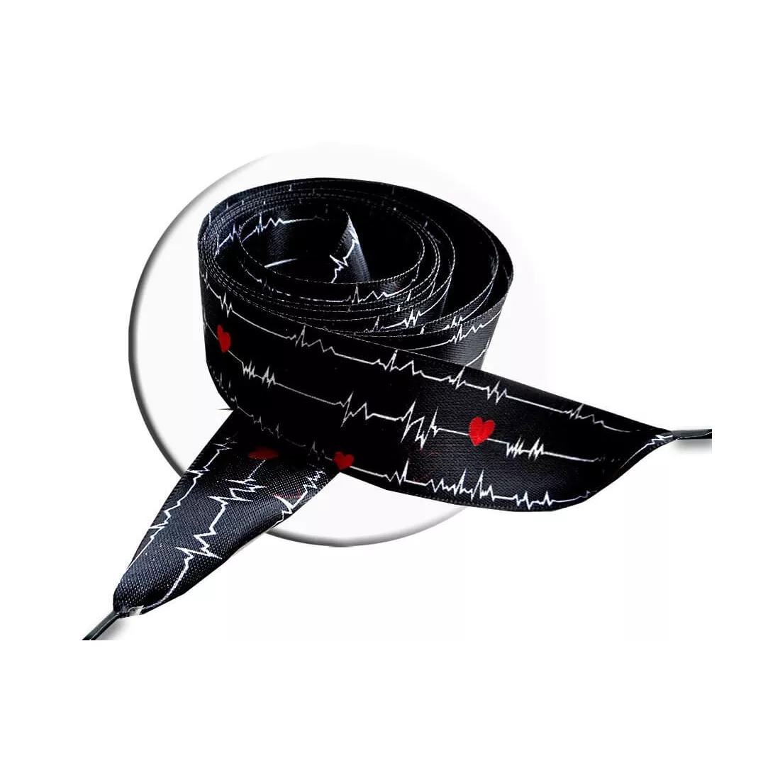 Paire de lacets de chaussures, en satin large noir profond, décorés de lignes d'électrocardiogramme blanches, semés de coeurs amoureux rouges : votre coeur flanche d'amour !