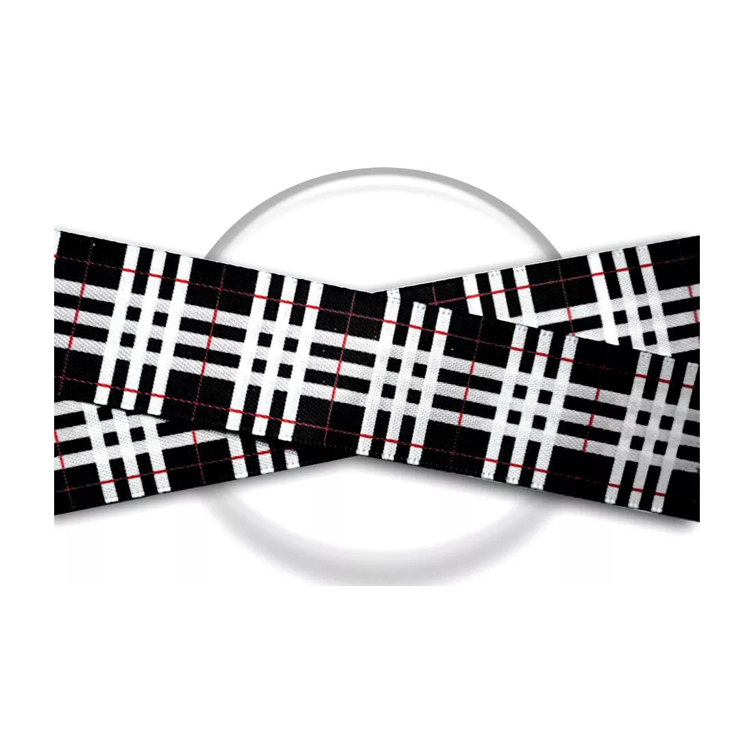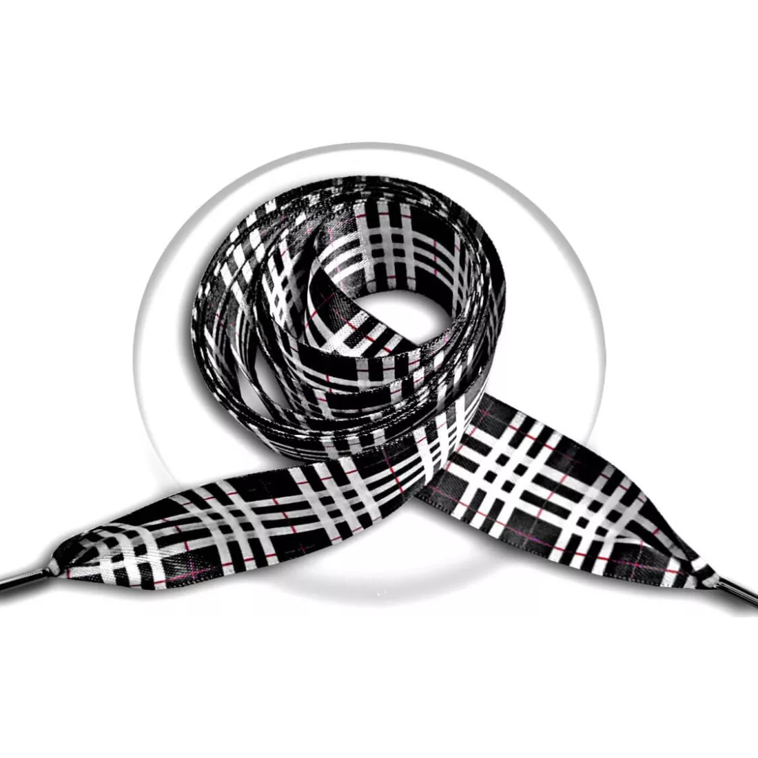 Paire de lacets de chaussures, en satin large, décorés façon tartan à carreaux écossais, en noir profond, rouge et blanc, pour un rendu chic, sobre et élégant