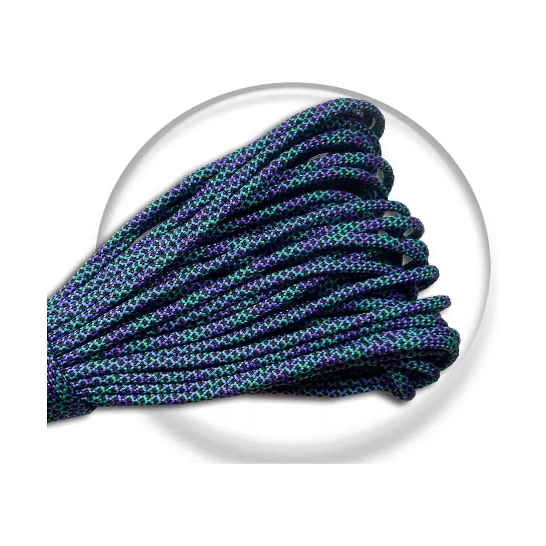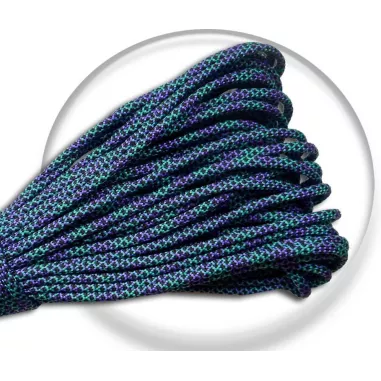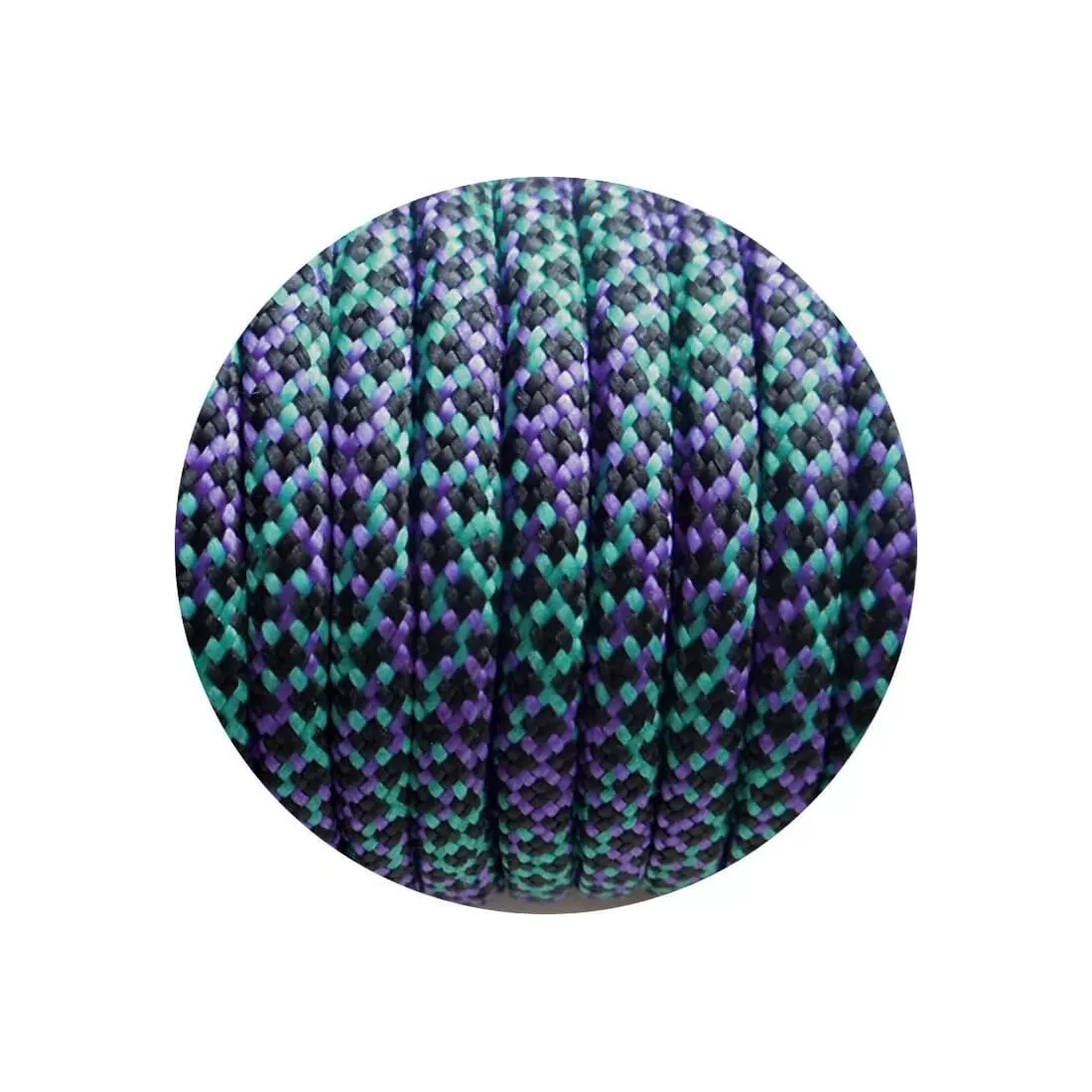 Paire de lacets de chaussures ronds, en paracorde solide et résistante (randonnée, course, paraboots, etc...), dans un joli mélange de coloris violet et vert pâle soulignés par des inserts noirs, donnant un original effet écailles.