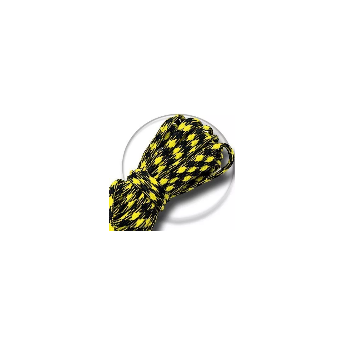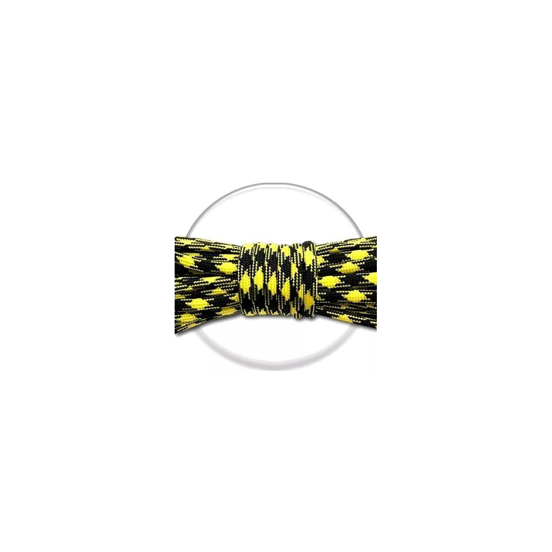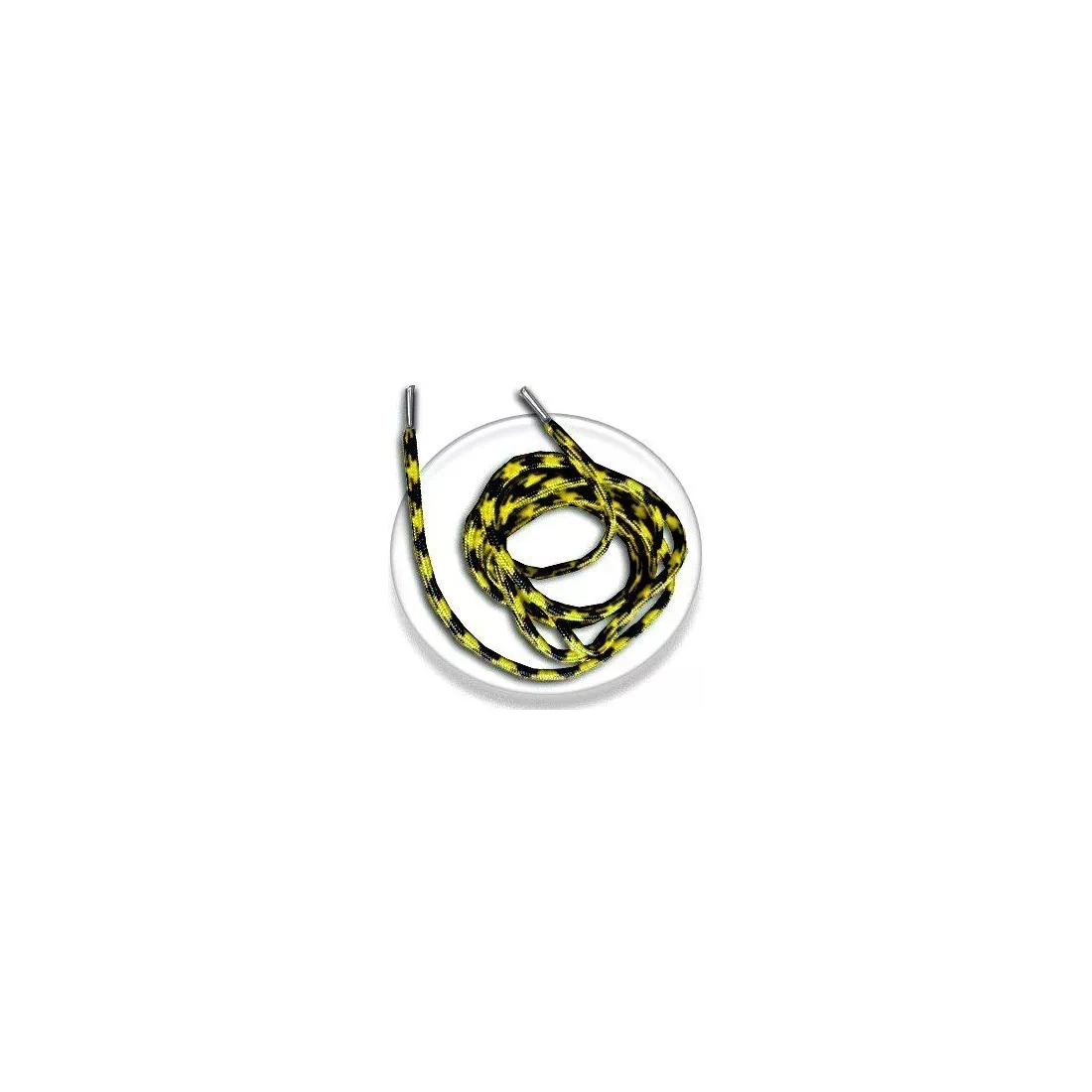 Paire de lacets de chaussures ronds, en paracorde solide et résistante (randonnée, course, paraboots, etc...), bicolores en noir et jaune.