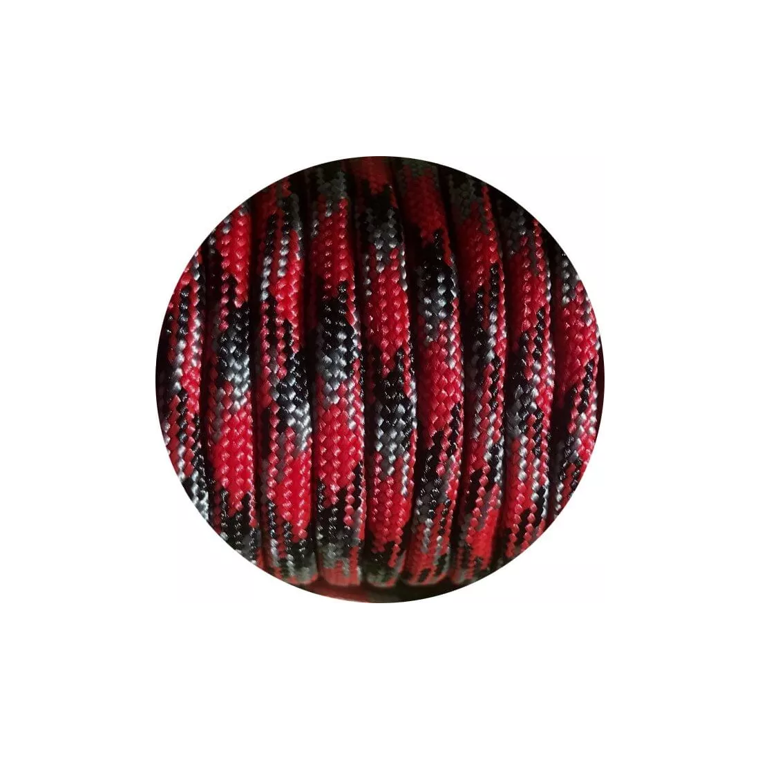 Paire de lacets de chaussures ronds, en paracorde solide et résistante (randonnée, course, paraboots, etc...) dans un magnifique coloris rouge cardinal, profond et densedécorés façon camouflage en gris clair et noir.