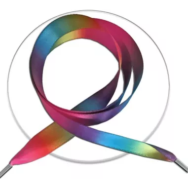 Lacets de chaussures en satin, soyeux, féminins et multicolores dans un magnifique dégradé strié de couleurs vives et chatoyantes, pour un superbe rendu arc-en-ciel bleu, rose, jaune, vert, rouge, orage, violet, ...