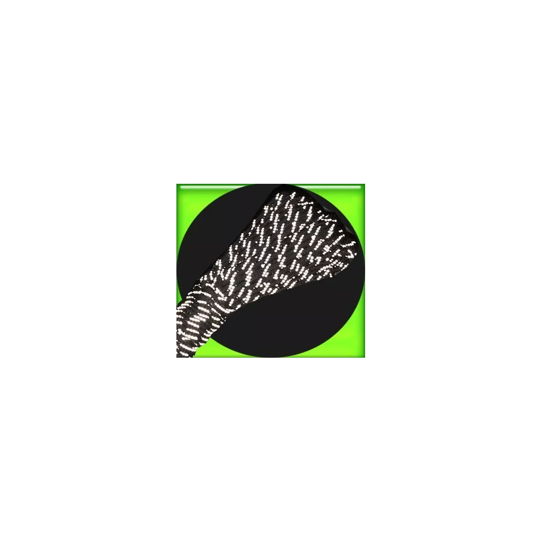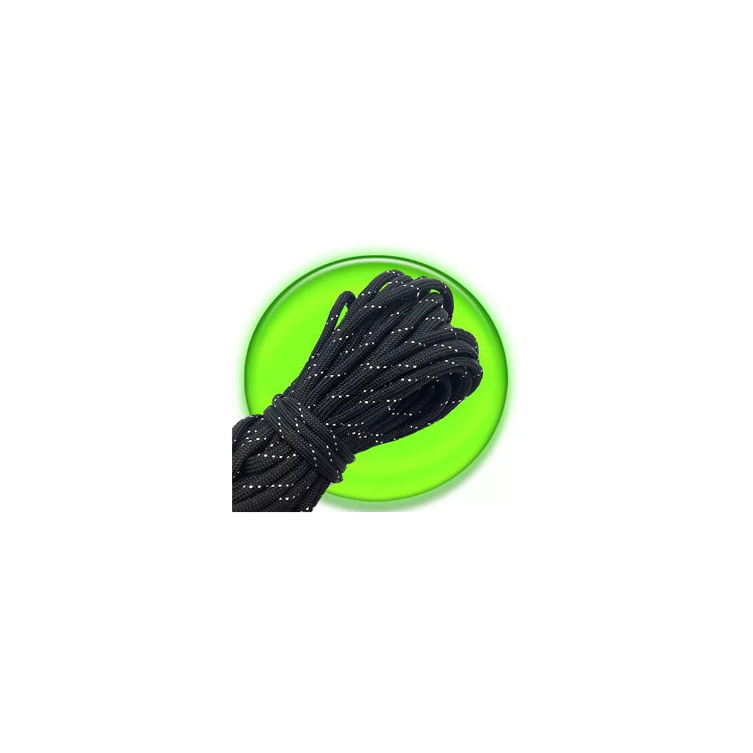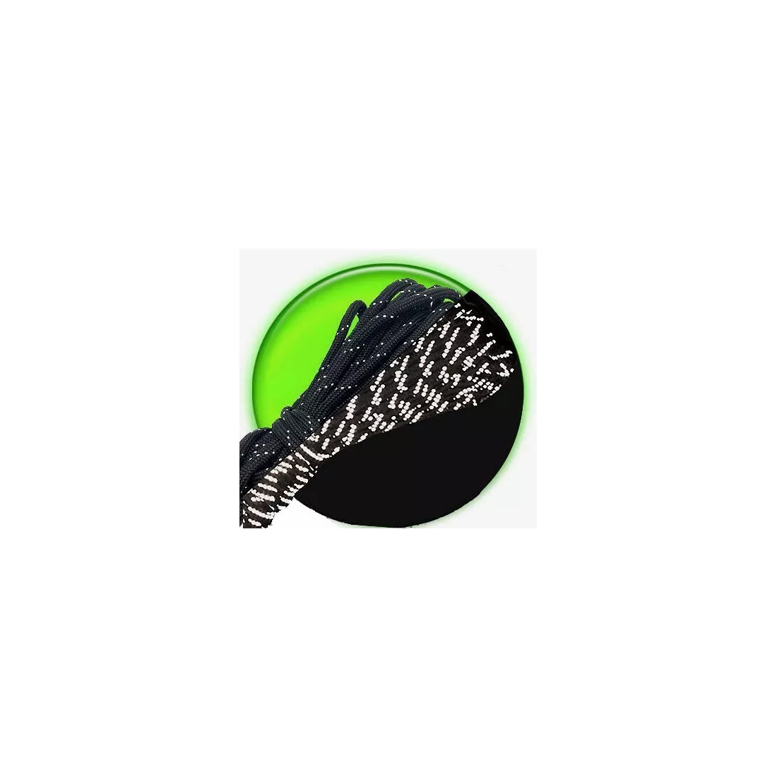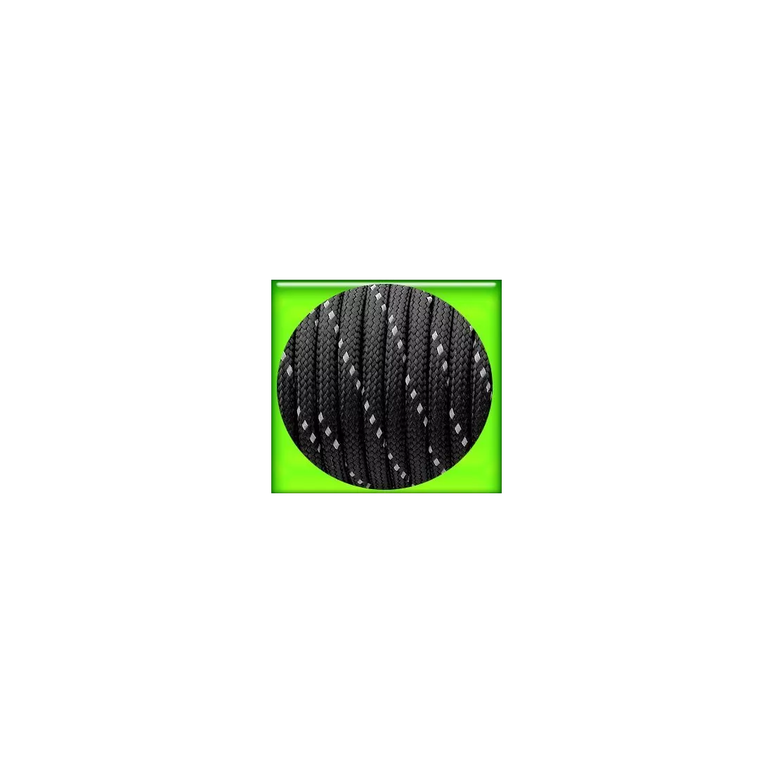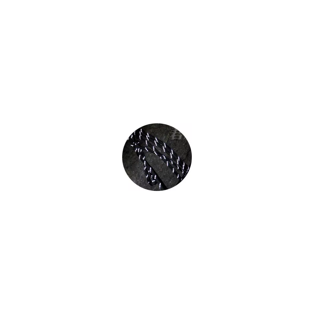 Paire de lacets de chaussures ronds, en paracorde solide et résistante (randonnée, course, paraboots, etc...) dans un coloris noir avec des inserts gris réflectifs.